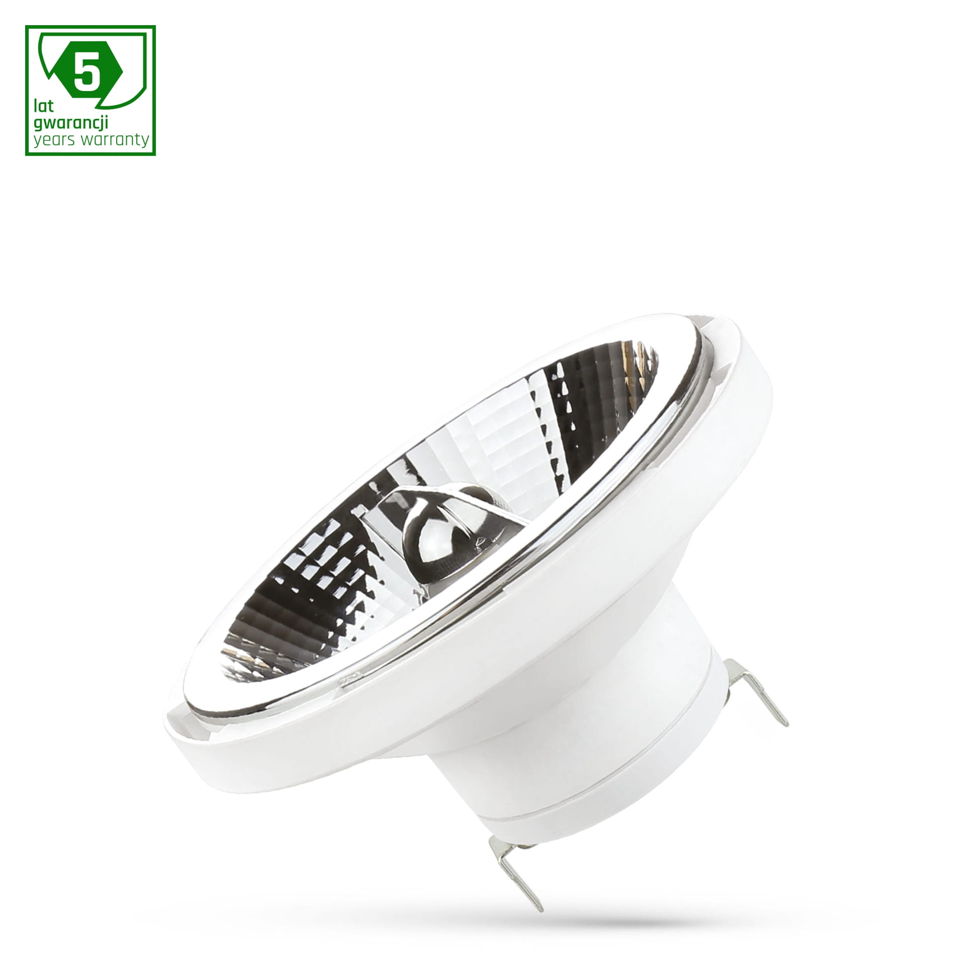 Źródło LED AR111 G53 11 W. Wykonane jest z komponentów o wysokiej jakości, potwierdzonej 5 letnią gwarancją. Świeci światłem o ciepłej barwie (3000K), które sprzyja relaksowaniu się i odpoczynkowi, sprawiając że oświetlane pomieszczenie jest bardziej przytulne. Wąski kąt świecenia 45° daje kierunkowe światło, dzięki czemu można lepiej wyeksponować wybrane przedmioty lub powierzchnie.